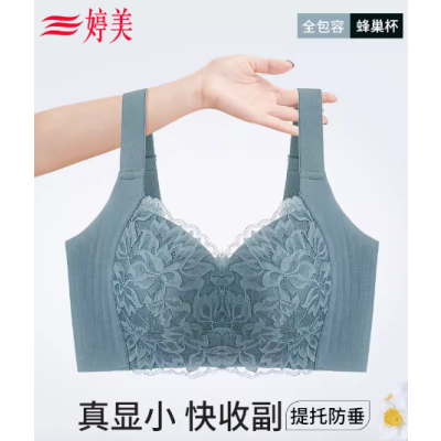 婷美轻薄蕾丝大胸显小内衣防垂调整型收副乳全包裹无钢圈大码文胸