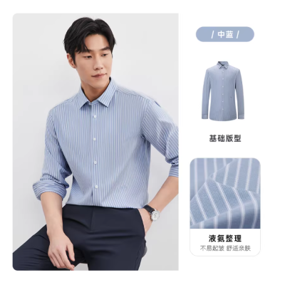 【液氨整理】七匹狼天丝抗皱长袖衬衫男春季新款休闲商务条纹衬衣