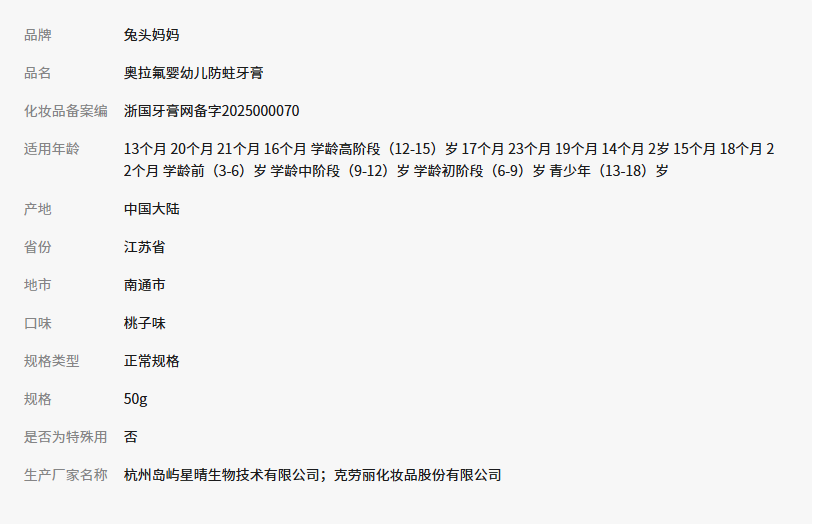 兔头妈妈儿童牙膏高纯奥拉氟儿童含氟牙膏防蛀牙龋齿3-6-12岁宝宝