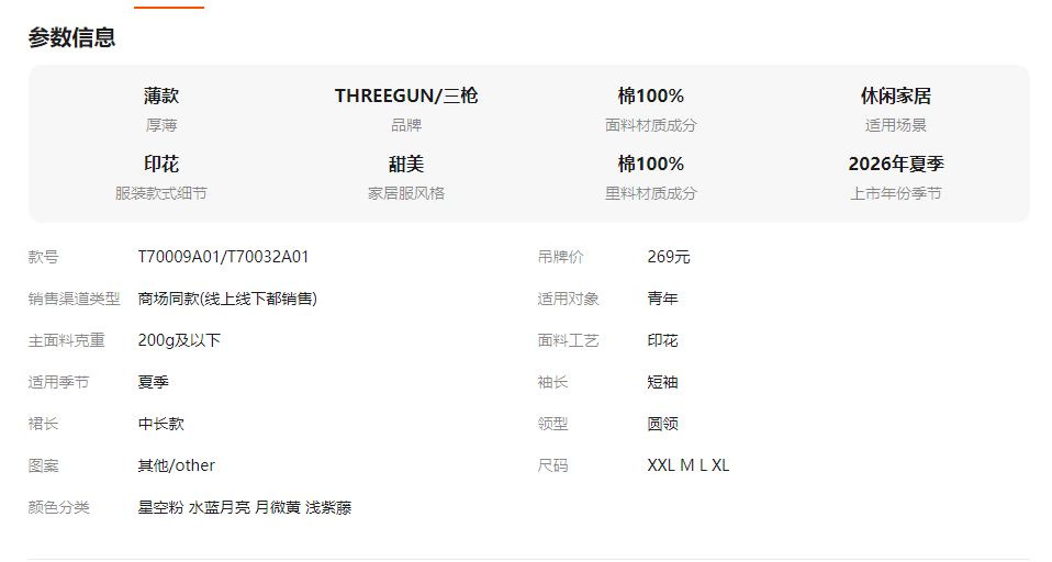 三枪家居裙2026春夏宽松短袖水柔棉纯棉薄款透气甜美纯棉睡裙女