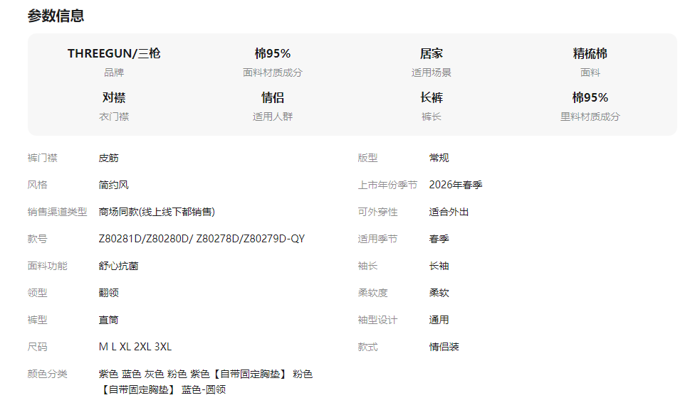 三枪春夏7A抗菌带胸垫家居服情侣简约开襟长袖男亲肤高棉睡衣女
